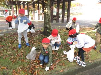 勧修寺公園にどんぐり拾いに行きました。「こんなに大きいのを見つけたよ。」「ぼうしがついているよ。」と言いながら,夢中になって拾っていました。その後,勧修寺公園の中を歩いて,秋見つけをしました。