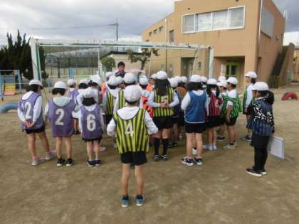 寒空の下,子ども達は元気に体を動かしています。サッカーの試合をする前に,体慣らしとしてパスやドリブルやシュートの練習をします。さあ,今日の試合は勝てるかな。