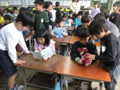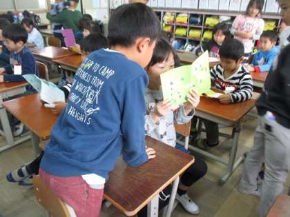 2年生は身近にあるものの特徴を生かしてできる楽しい遊びを考えて作っています。12月11日(水)には,1年生を招いて「スマイルおもちゃまつり」を開きます。今日はその招待状を渡しに行きました。招待状は国語科で学習した「しかけカード」になっていて,1年生も大喜びでした。
