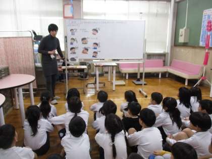 3学期の身体計測がありました。はじめに,風邪の原因や予防法について養護教諭から話がありました。せきやくしゃみによってウイルスがどれぐらい飛ぶのかをテープで表したときには,予想以上に遠くまで飛ぶことを知り,とても驚いていました。
