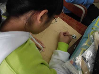 コリントゲームを作ります。アイデアスケッチを板にうつし,絵の具で色を塗っていきます。
