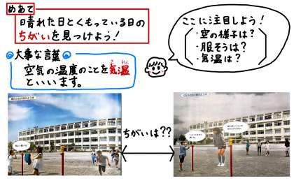 このところ一気に暑くなりましたね。天気は日々変わります。4年生の理科の学習では,晴れた日と雨の日の違いに注目して学習していきますよ。今日は写真を見て,それぞれの天気の時にはどんな違いがあるのか考えてみましょう!