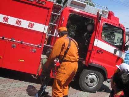 「どうして へるめっとが あるの。」と しつもんしたり,じゅんばんに しょうぼうしゃに のせてもらったり しました。