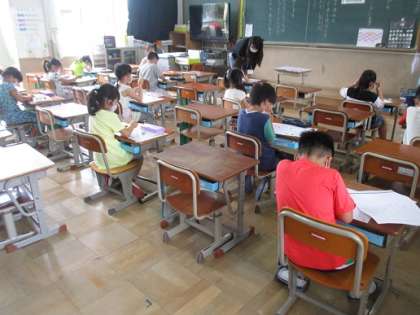 1年生で学習した漢字の復習が終わった後に,いろいろな形の三角形や四角形を見つけて色を塗るプリントをしました。色を塗っていくとどんな形ができたかな。