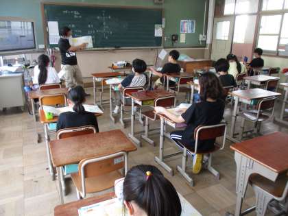 社会の教科書の世界地図を見ながら,世界にはどんな国があるのかを出し合いました。その後,地図にある青い線を「緯度」「経度」と呼ぶこととその意味について学習しました。