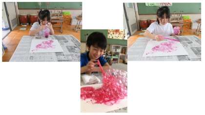 しゃぼん玉えきに絵の具をとかして,ストローでふいてみました。画用紙にふきつけるとアワアワになってあじさいの花ができるよ。色を変えるとカラフルなあじさいの花ができるね。