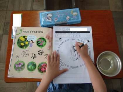 せいかつかでは,6しゅるいの たねの なかから 1しゅるいを えらんで,かんさつかあどを かきました。