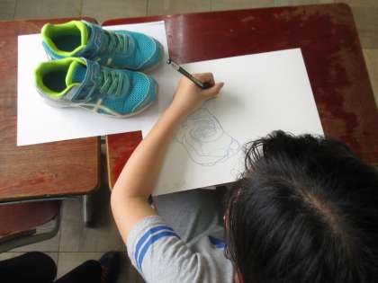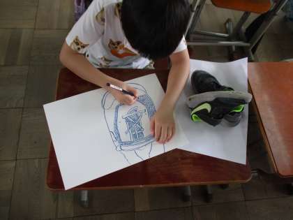 自分の靴をよく見てスケッチをしました。さすが5年生,細かいところまでよく見て描くことができました。次の時間には水彩絵具で色を塗っていきます。