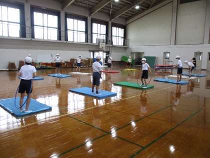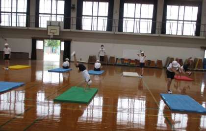 フラフープで体を温めた後,マット運動をしました。最初は前転や後転のような簡単な技から始め,その後5年生の時に練習した「倒立前転」や「ロンダート」などの技に挑戦しました。