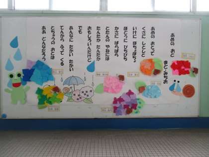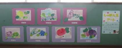 わかば学級の教室の前には,みんなが折り紙で作ったあじさいが貼られていて,とても華やかです。階段の踊り場には,「しゃぼん玉アート」の作品が飾られています。