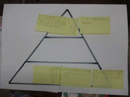 「白いぼうし」のお話を読んで,自分が不思議だと思った出来事をグループで出し合い,一番考えを深めたいと思ったことを問いの形にする学習をしました。