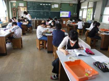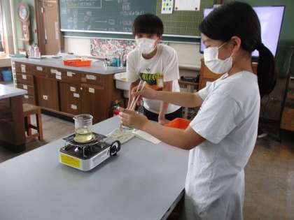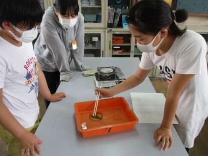 一部分にアルミニウムはくをかぶせたジャガイモの葉をヨウ素液につけたとき,日光に当たった部分とアルミニウムはくをかぶせた部分では色の変化にどんな違いがあるかを調べ,日光に当たると葉でデンプンが作られること確認しました。