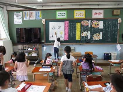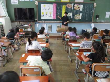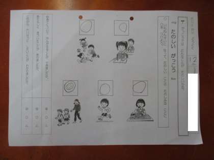 きょうかしょの えをみて きもちを そうぞうしたり,どうして みんなが にこにこしているのかを かんがえたりしました。そして,じぶんが たのしみにしていることを かんがえて ぷりんとに ○をしました。えんそくに ○をするひとが いちばん おおかったです。