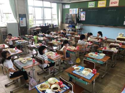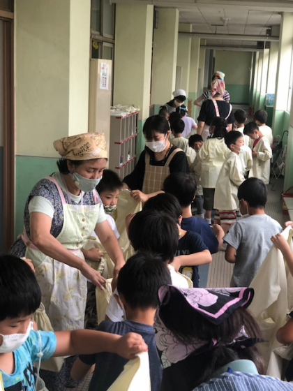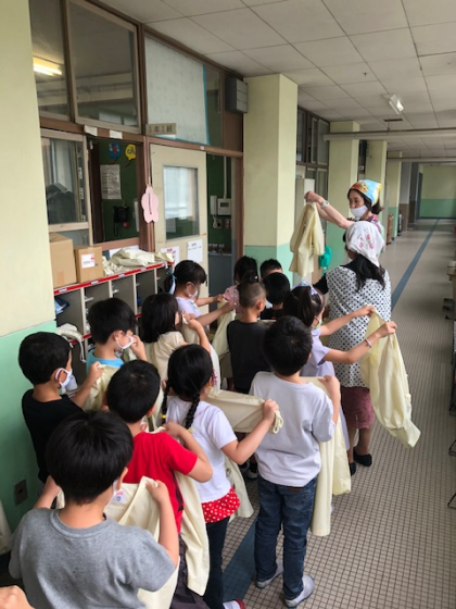 1年生の給食準備時間をのぞいてみました。給食当番さんはエプロンのたたみ方を練習していました。置いてたたむのも難しいのですが,給食時間は置く場所がなく,空中でたたむのでコツが必要です。