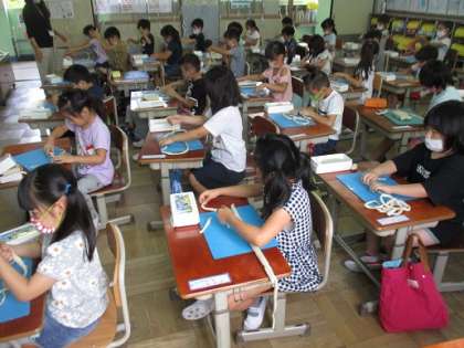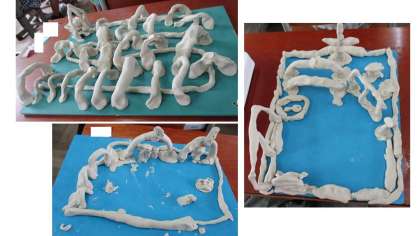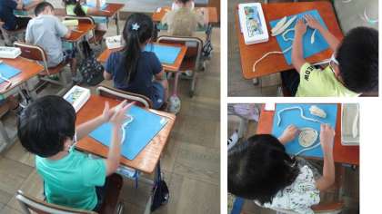 ねんどを のばしながら,いろいろな ながさや ふとさのひもを つくりました。そのあと,ひものかたちを かえたり,いろいろなかたちの ひもをくみあわせたりしながら くふうして さくひんを つくりました。みんな むちゅうで ねんどを のばしていました。