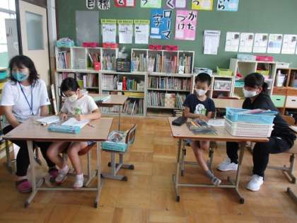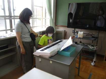 わかば学級の教室をのぞくと,3年生は算数,4年生は音楽の学習をしていました。できるようになる楽しさを味わいながら,学習を進めていました。