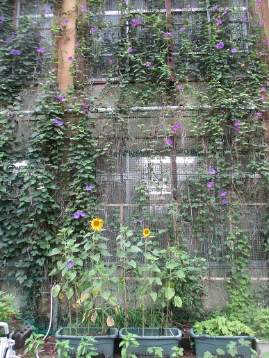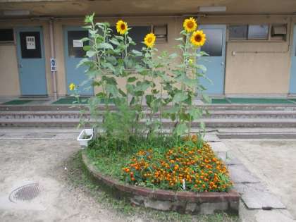 学校の花壇のひまわりが咲きました。鮮やかな黄色の花を見ると,不思議と元気が出てきます。緑のカーテンの西洋朝顔も紫色のきれいな花を咲かせています。