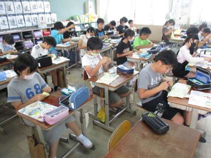 練習布で手縫いの練習を続けている5年生。今日はボタンつけに挑戦しました。説明ビデオを参考にしながら,丁寧に縫いつけていました。針と糸の扱いに随分慣れた様子で,これまでの練習の成果が感じられました。