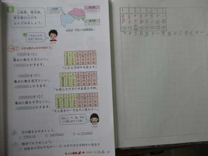 一万をこえる数には,十万,百万,千万があることを知りました。ノートに自分で位取り表を書いて数字を入れていくことで,どんどん大きい数を読むことができるようになりました。