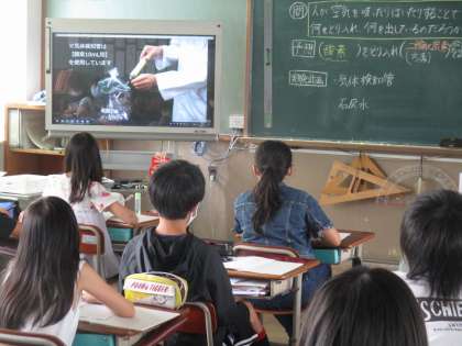今回は実験をせずに,動画で確かめました。予想通り,吸う空気に比べて吐いた空気には酸素が減り,二酸化炭素が多く含まれていることがわかりました。