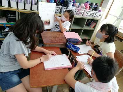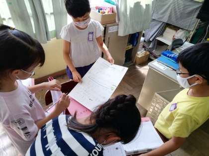 4年生の総合的な学習の時間では,福祉をテーマに学習しています。この日の学習では,グループに分かれて調べたことを画用紙にまとめ,他のグループに向けて説明しました。説明する人は,相手が聞きやすいように,まとめたことが見えるようにしたり,間を取って話したりしていました。聞く人も,メモを取ったり,質問したりと一生懸命聞いていました。