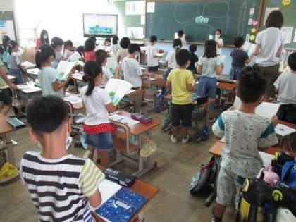 3びきの あおむしの きもちを そうぞうして,ふきだしに かきました。そのあと,あおむしに なりきって,どうさを つけながら せりふを はっぴょう しました。