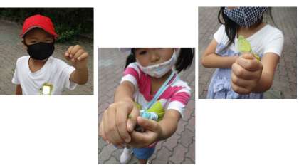 こうしゃのまわで むしを さがしました。「ばったをつかまえたよ」「ダンゴムシを みつけたよ」「ちょうちょが ゆびに とまったよ」と,たくさんの むしを みつけて なかよしに なりました。アゲハチョウも ゆうがに とんでいましたね。