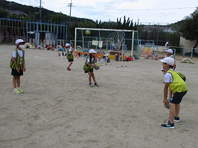 パスゲームの学習が始まりました。今日は準備の仕方と体ならしの仕方を知りました。体ならしでは,「山パス」「ワンバウンド」「むねパス」の練習をしました。ゲームをするのが楽しみですね。
