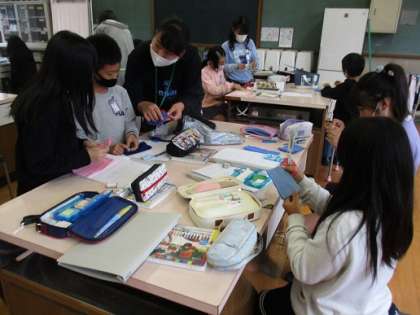 手芸クラブは,お気に入りの布で小物入れを製作しています。