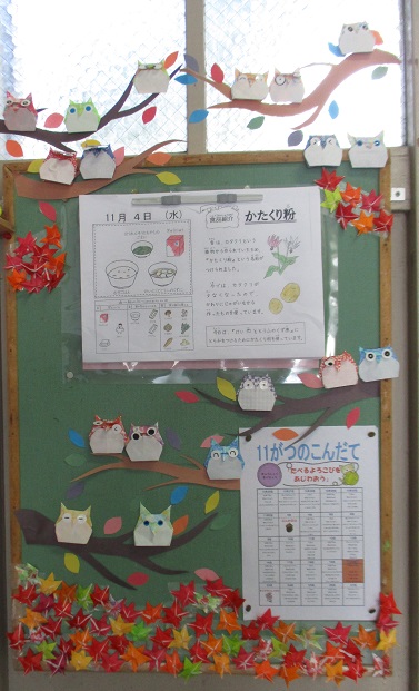 給食室前の掲示が新しくなりました。今月はフクロウと紅葉で秋の深まりが感じられる掲示になっています。フクロウの表情がかわいいですね。