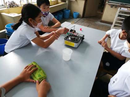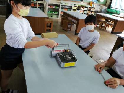 今日は「金属を温めると,金属の体積はどうなるのか」という学習問題について,実験を通して調べました。火を使った実験でしたが,安全に気を付けながら取り組むことができました。理科室には,金属の体積が変化することに対して,「おー!!」「えー!すごい!」という驚きの声が響いていました。