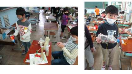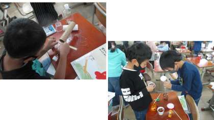 どんぐりを使ったおもちゃ作りの続きをしました。家から持って来た材料とどんぐりを組み合わせて,オリジナルのおもちゃを工夫する人が増えてきました。みんな時が経つを忘れて夢中で作っていました。