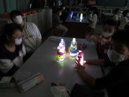 ゆめいろランプが完成したので,暗い部屋でランプをつけて鑑賞をしました。周りが暗くなると同時に,ランプのきれいな光が部屋の中に浮かびあがり,「ワッ。」と歓声があがりました。家でもぜひ,楽しんでください。
