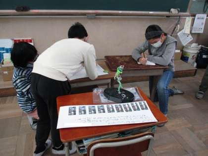 「立ち上がれワイヤーアート」と「形が動く絵が動く」の鑑賞をしました。「形が動く絵が動く」は,コマ撮りアニメーションの仕組みを生かして楽しい動きや変化のある作品を作る学習です。ランドセルや文房具を少しずつ動かして写真でコマ撮りをして作品を作りました。