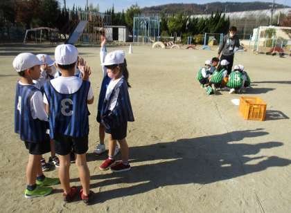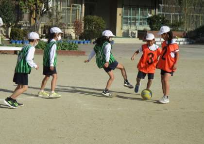 2年生がボールけりゲームをしていました。1回目と2回目の試合の間に作戦会議の時間をもち,試合に出る人や攻め方や守り方の工夫について確認していました。みんな一生懸命にボールを追いかけていました。