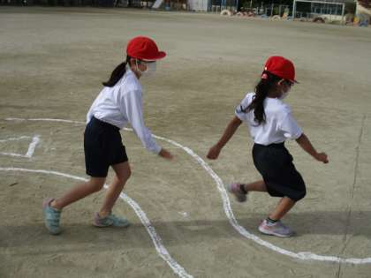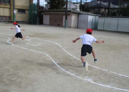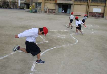 「とびあそび」の学習が始まりました。今日は,川に見立てた曲線を跳び超える「川とびあそび」をしました。子どもたちは夢中になってどんどん跳んでいきます。たくさん跳んで,体が温まったかな。