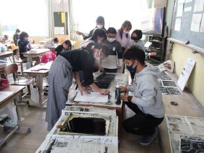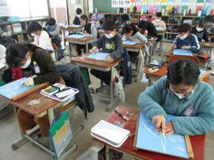 彫刻刀で版木を彫って版画の制作をしています。版が出来上がった人は自分で刷っていきます。彫っている人は,安全面に気を付けて慎重に彫っていきます。みんな集中して取り組んでいますね。