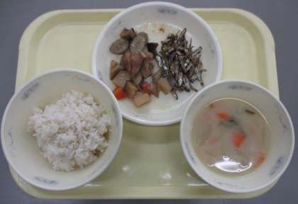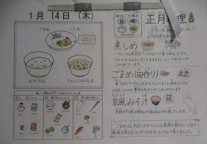 今日は和献立(なごみこんだて)で,お正月料理をいただきました。京風味噌汁には京都でとれた里いもや大根,にんじん,せりなどの旬のお野菜がたっぷり入っていました。白みそのお汁もおいしかったです。
