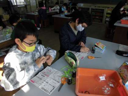 説明書を見ながら作っていき,いざスイッチオン!!鉄くぎが引きついて「わー!くぎがついた!」電磁石の働きを確認することができました。