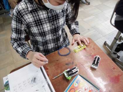 今日は,電池の数を増やして,「電流の大きさと電磁石の強さ」の関係を調べました。「電池の数を2個にしたら,くぎがたくさんついた!」とみんな電磁石の強さを確かめることができました。
