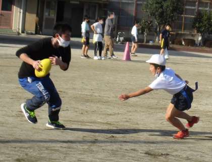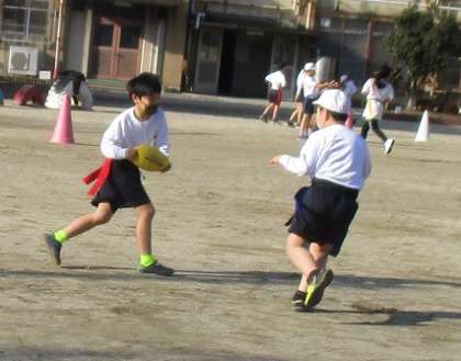1対1でタグラグビーをしていました。攻める側はラグビーボールを持ってゴールラインを目指し,守る側は攻める側のタグを取ろうとします。2人の駆け引きが見ごたえがあります。