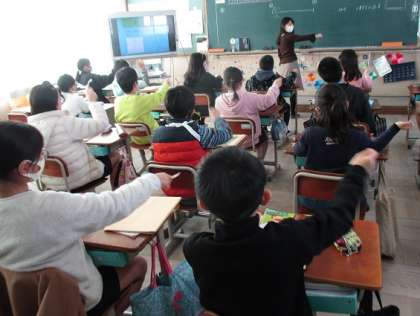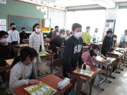 琴と尺八で演奏されている「春の海」を聴いて,日本の伝統的な楽器の音色に親しみました。2つの楽器の音色を聞き分けるために,琴グループと尺八グループに分かれて,琴の音が聞こえたら琴グループが立ち,尺八の音が聞こえたら尺八グループが立つという学習もしました。琴や尺八の音色や旋律の美しさを感じ取りながら聴くことができたようです。
