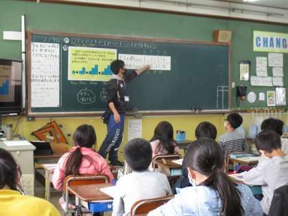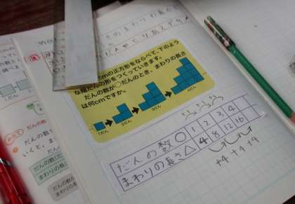 正方形を1段2段・・・と階段のように積んだ時の周りの長さの求め方を考えました。「段の数」と「周りの長さ」の関係を表にまとめて,変わる数量の関係を見つけ,〇や△を使った式にして説明しました。学習はどんどん難しくなりますが,いろいろな考え方ができるようになる喜びも感じてくれると嬉しいです。