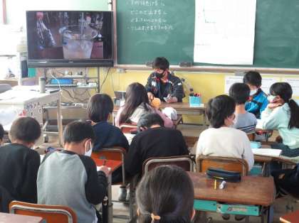 大型テレビに映し出される実験の様子を見ながら,水の温度を折れ線グラフに記録したり,水の様子がどのように変化するかを確認したりしました。