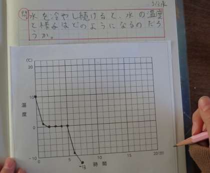水を冷やし続けると,水の温度と様子はどのようになるかを予想した後,実験をしました。