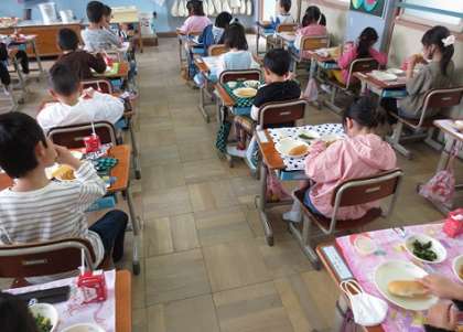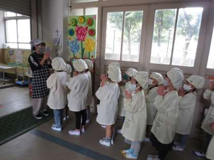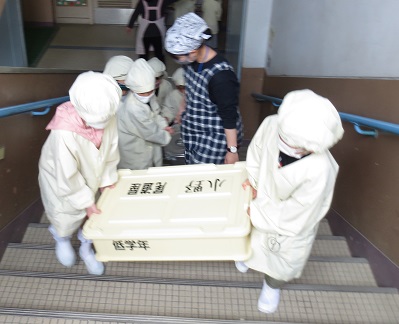 給食当番が給食室から教室までパンや牛乳,食器,おかずを運びました。残さずにおいしく食べることができましたね。
