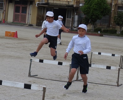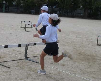 スタート係・走者・計時係にわかれて,順番にハードル走の練習をします。3歩または5歩のリズムで走れるインターバルを確かめてハードルを走り越し,ゴールを目指します。