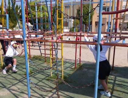 今日は,総合遊具の1階でじゃんけんあそびをしました。どちらかの手は必ず総合遊具をつかんでいるというルールで両端から進んで行き,出会ったところでじゃんけんをします。楽しみながら安全に遊ぶルールを覚えることがでました。