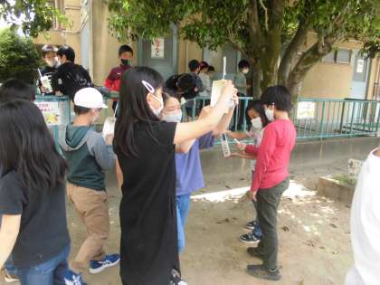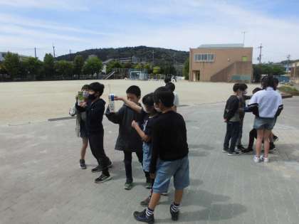 理科では,晴れの日と曇り・雨の日の気温の変化を調べています。温度計を使って正しく気温が測定できるか,みんなで確認しました。グループの子たちで声を掛け合って,気温を測定することができました。