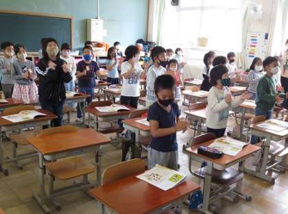 「小犬のビンゴ」を拍にのって歌いました。歌詞の「B」「I」「N」「G」「O」のところで手拍子を打ったり,体のいろいろな部分を叩いたりして,体を動かしながら楽しく歌いました。